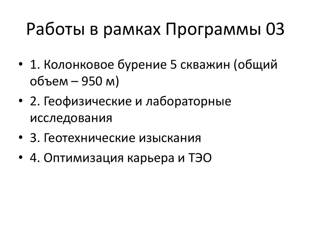 Работы в рамках Программы 03• 1. Колонковое бурение 5 скважин (общий