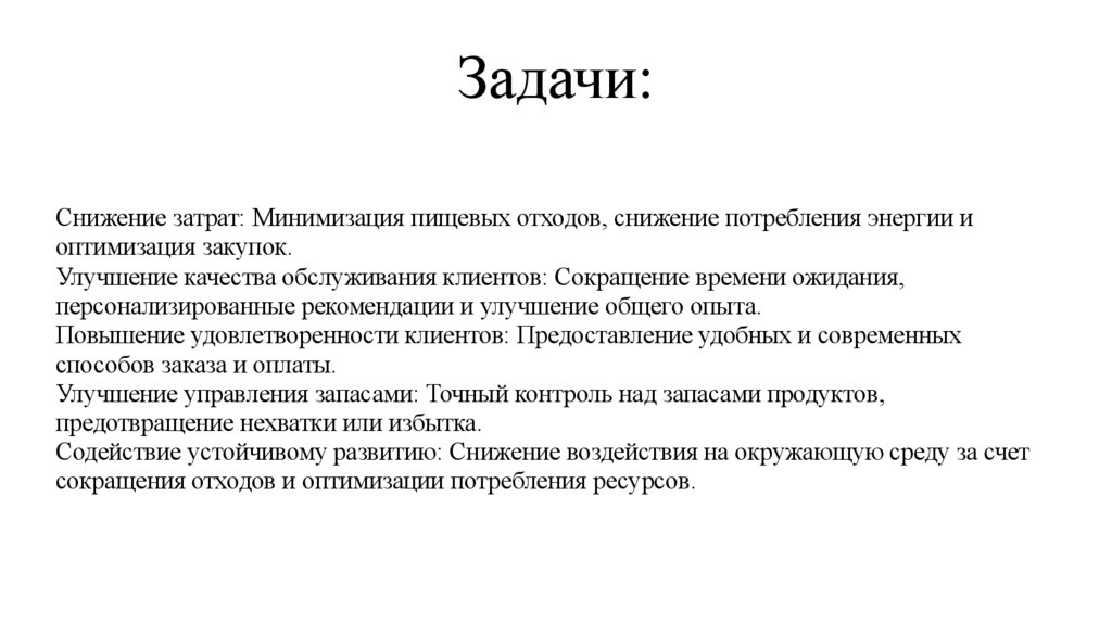 Задачи:Снижение затрат: Минимизация пищевых отходов, снижение потребления энергии и