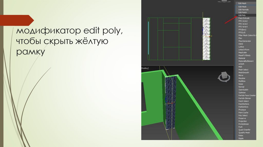 модификатор edit poly,чтобы скрыть жёлтую