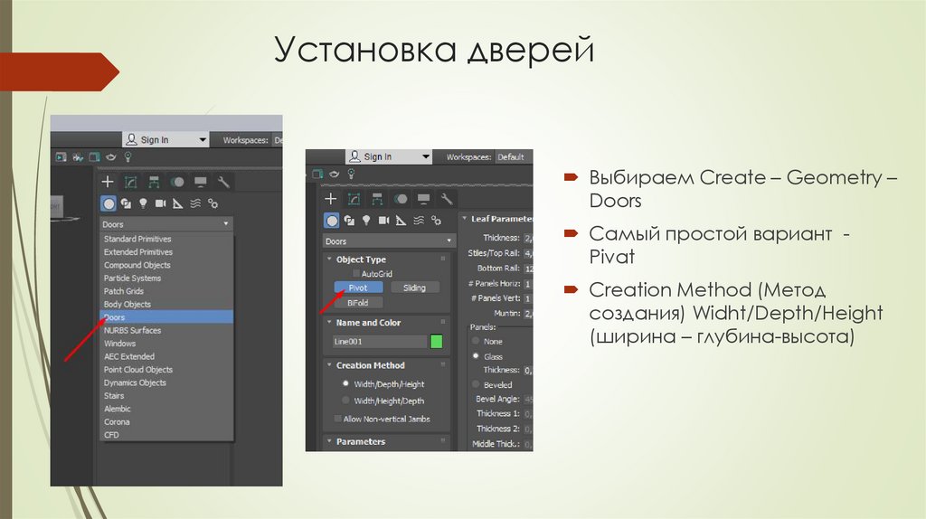 Установка дверейВыбираем Create – Geometry –