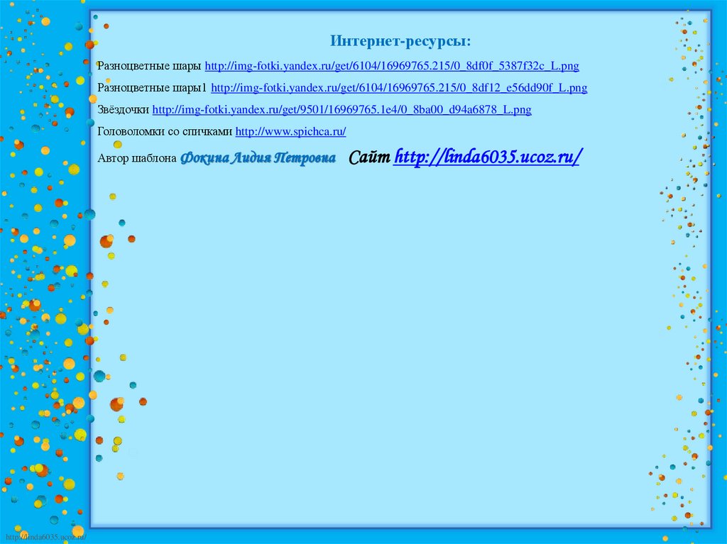 Интернет-ресурсы:Разноцветные шары http://img-fotki.yandex.ru/get/6104/16969765.215/0_8df0f_5387f32c_L.png