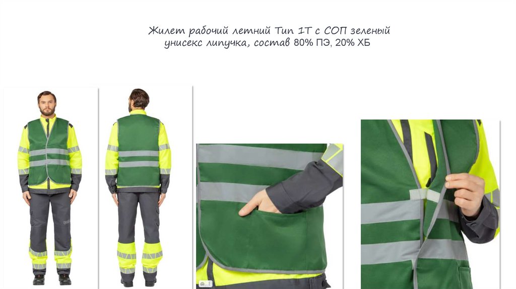 Жилет рабочий летний Тип 1Т с СОП зеленыйунисекс липучка, состав 80% ПЭ, 20% ХБ