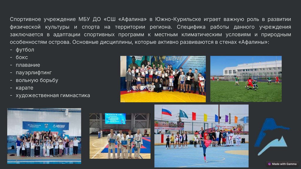 Спортивное учреждение МБУ ДО «СШ «Афалина» в Южно-Курильске играет важную роль в развитиифизической культуры и спорта на территории региона. Специфика работы данного учреждения