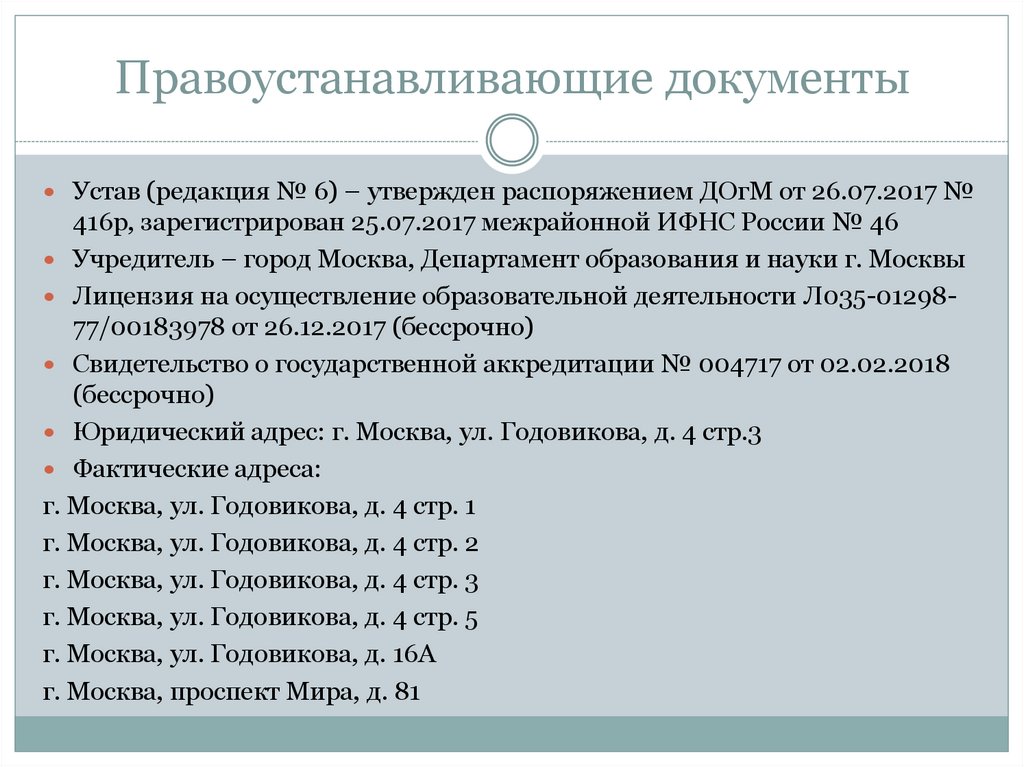 Правоустанавливающие документыУстав (редакция № 6) – утвержден распоряжением ДОгМ от 26.07.2017 №