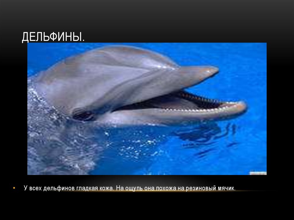 ДЕЛЬФИНЫ.У всех дельфинов гладкая кожа. На ощупь она похожа на резиновый мячик.