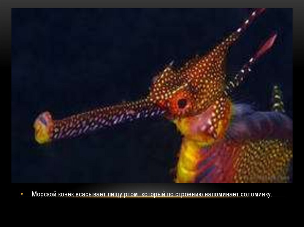 Морской конёк всасывает пищу ртом, который по строению напоминает соломинку.