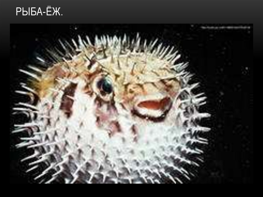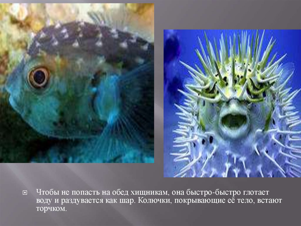 Чтобы не попасть на обед хищникам, она быстро-быстро глотаетводу и раздувается как шар. Колючки, покрывающие её тело, встают