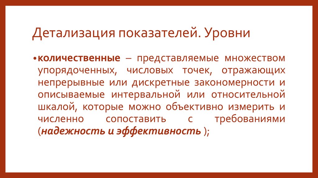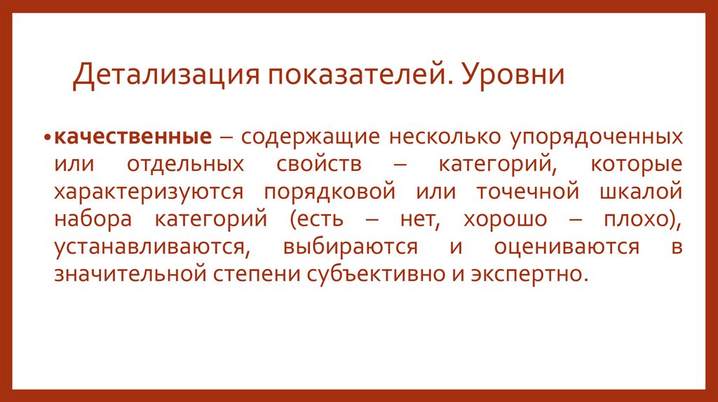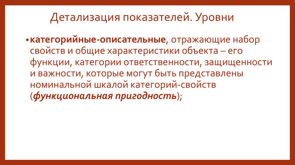 Детализация показателей. Уровни• категорийные-описательные, отражающие набор