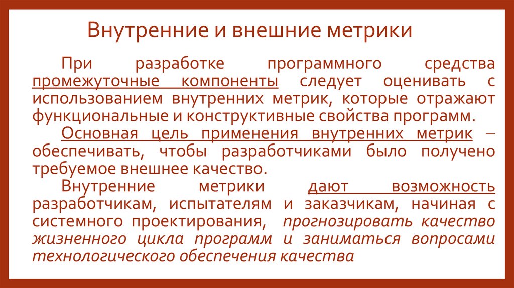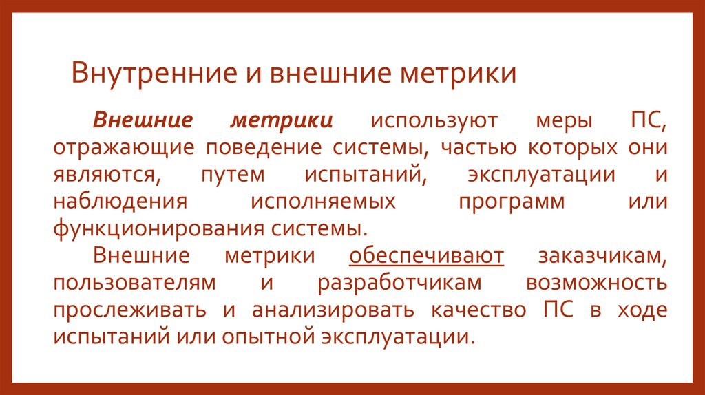 Внутренние и внешние метрикиВнешние метрики используют меры ПС,