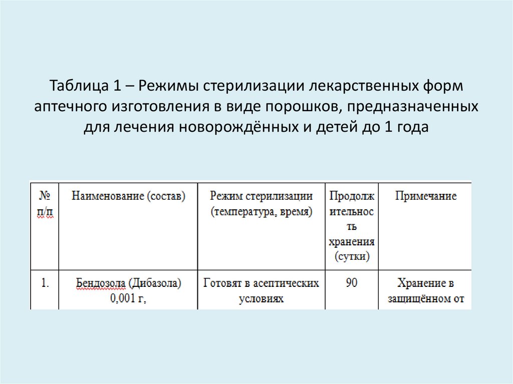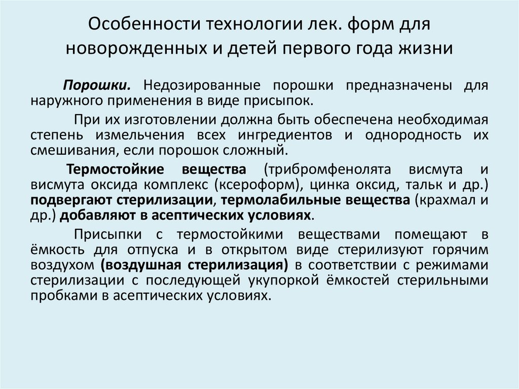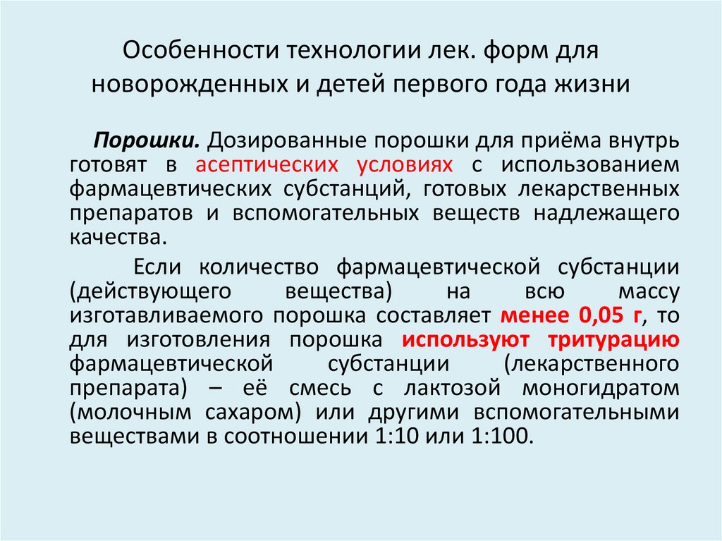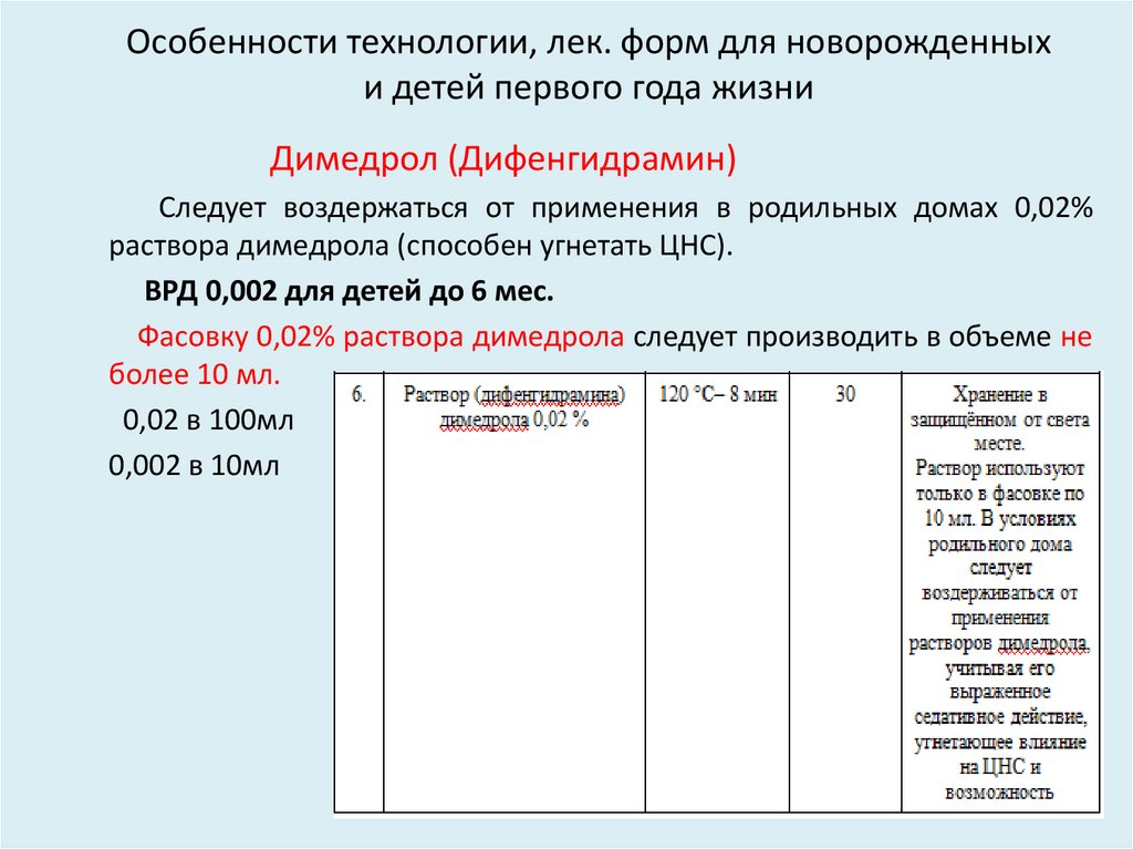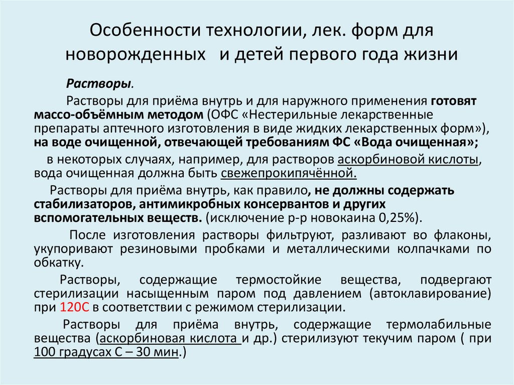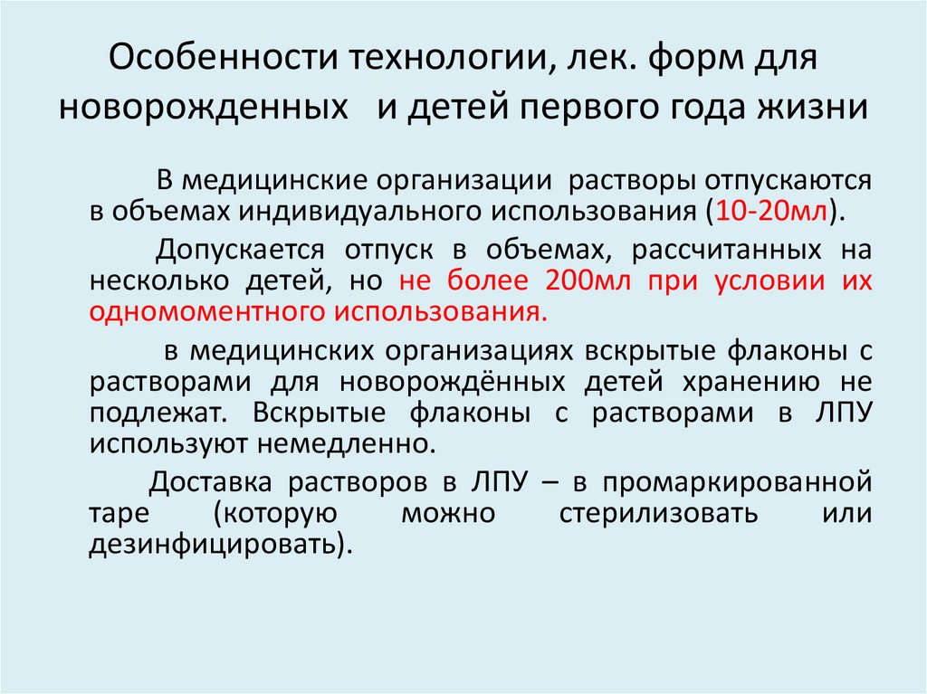 Особенности технологии для лечения новорождённых детейи детей до 1 года в условиях аптеки