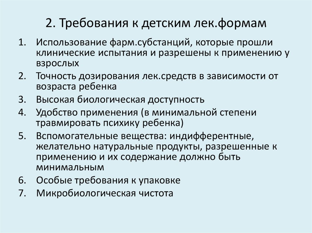 2. Требования к детским лек.формам1. Использование фарм.субстанций, которые прошли