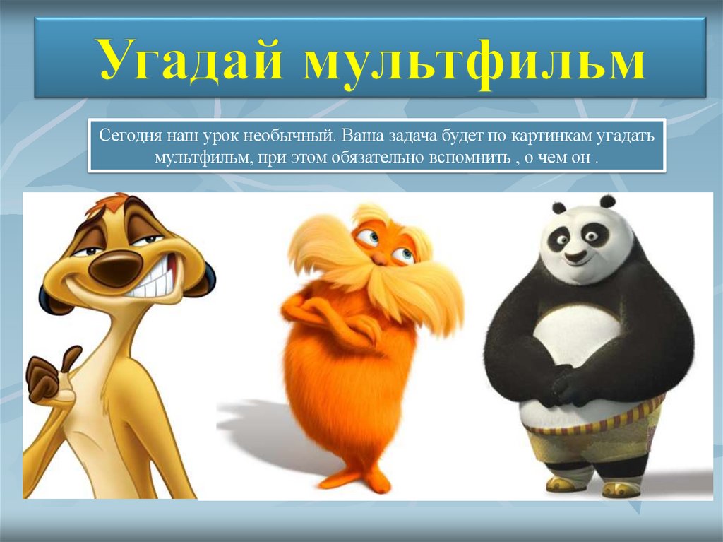 Сегодня наш урок необычный. Ваша задача будет по картинкам угадатьмультфильм, при этом обязательно вспомнить , о чем он .