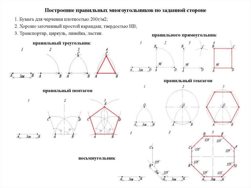 - я научился строить 3,4,5,6 и 8-угольники по заданной стороне;