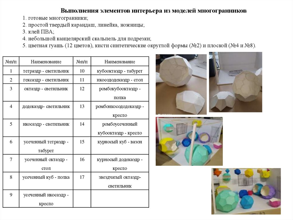 Выполнения элементов интерьера из моделей многогранников1. готовые многогранники;