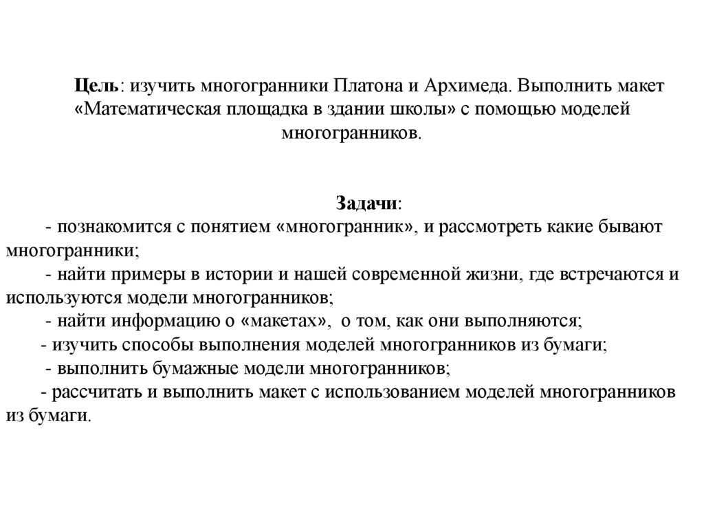 Цель: изучить многогранники Платона и Архимеда. Выполнить макет«Математическая площадка в здании школы» с помощью моделей