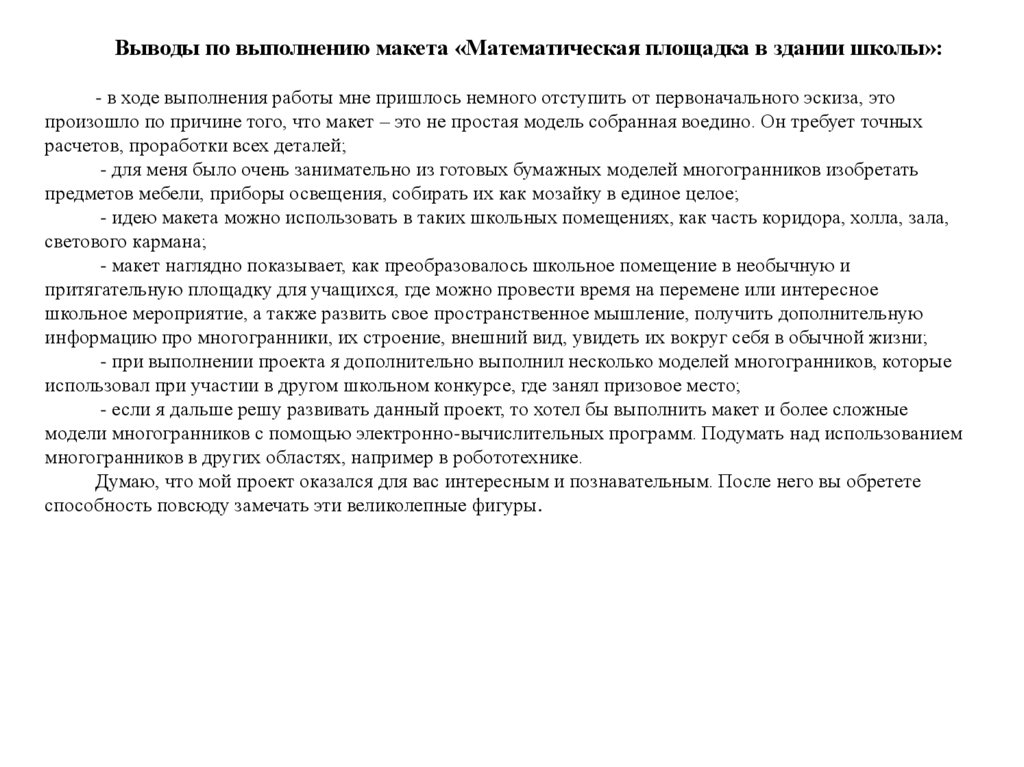 Выводы по выполнению макета «Математическая площадка в здании школы»:- в ходе выполнения работы мне пришлось немного отступить от первоначального эскиза, это