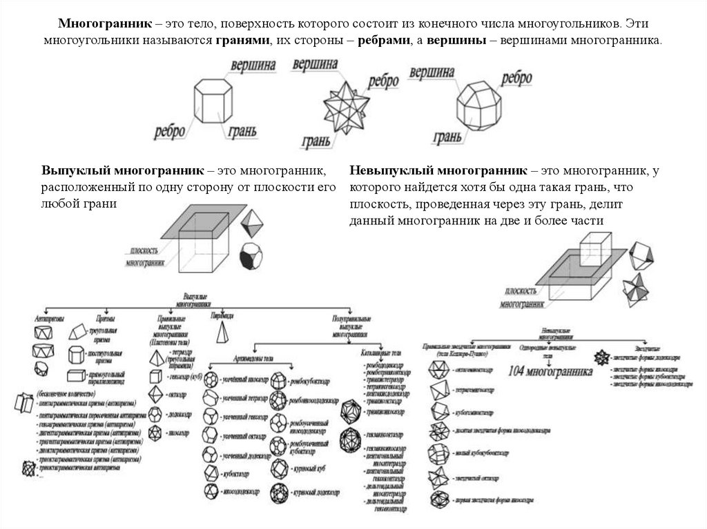 Многогранник – это тело, поверхность которого состоит из конечного числа многоугольников. Этимногоугольники называются гранями, их стороны – ребрами, а вершины – вершинами многогранника.