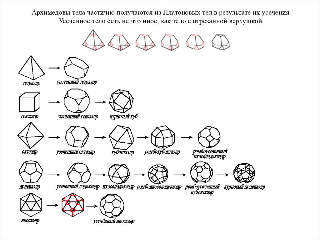 Архимедовы тела частично получаются из Платоновых тел в результате их усечения.Усеченное тело есть не что иное, как тело с отрезанной верхушкой.