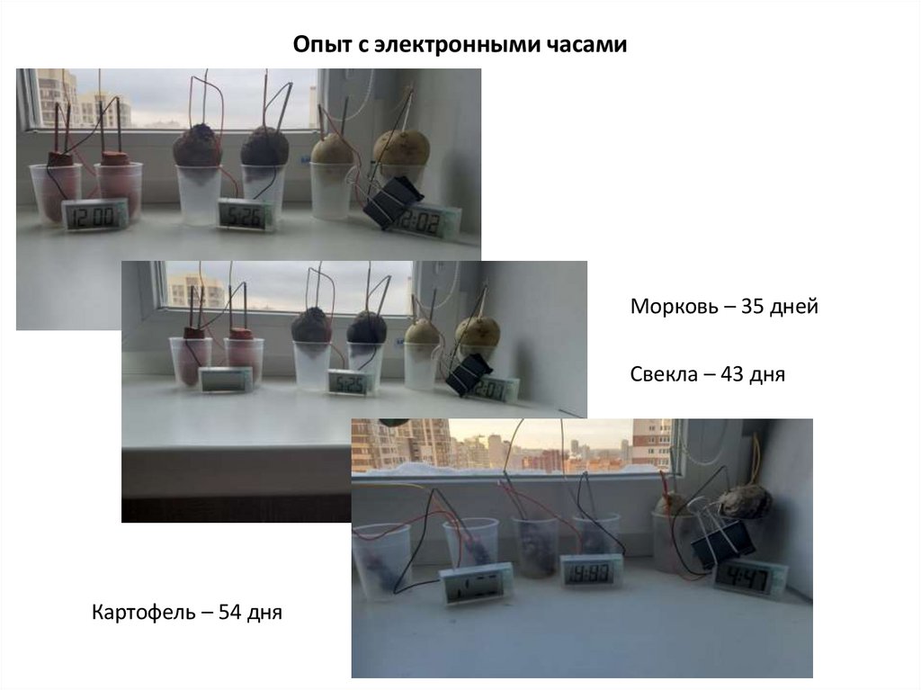 • От батарейки из овощей заработали электронные часы и светодиод.