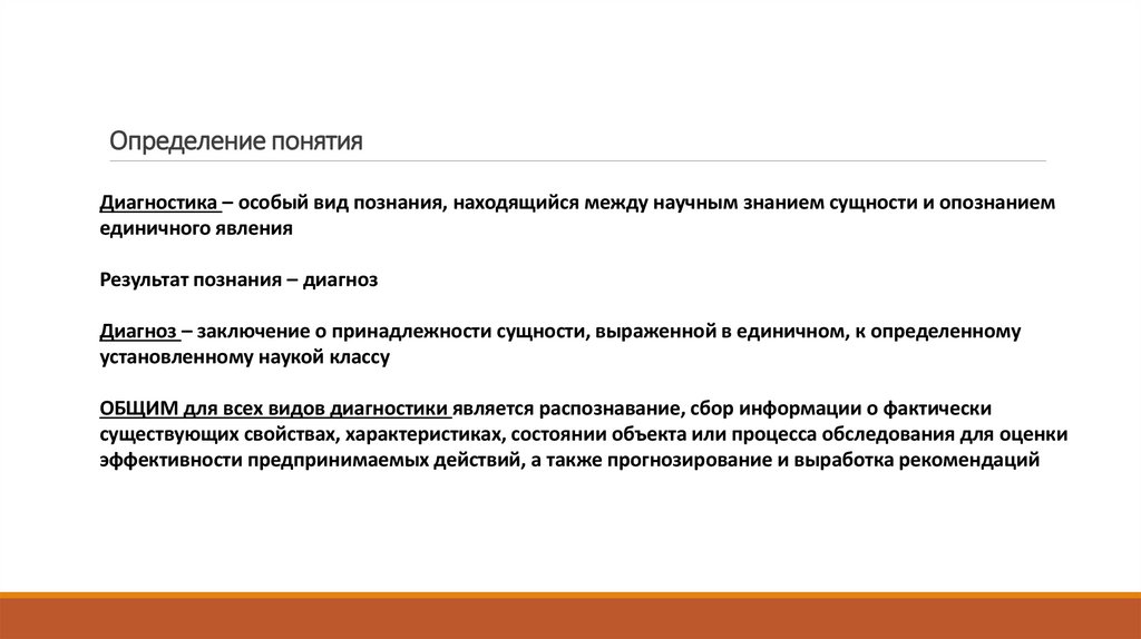 Диагностика – особый вид познания, находящийся между научным знанием сущности и опознаниемединичного явления