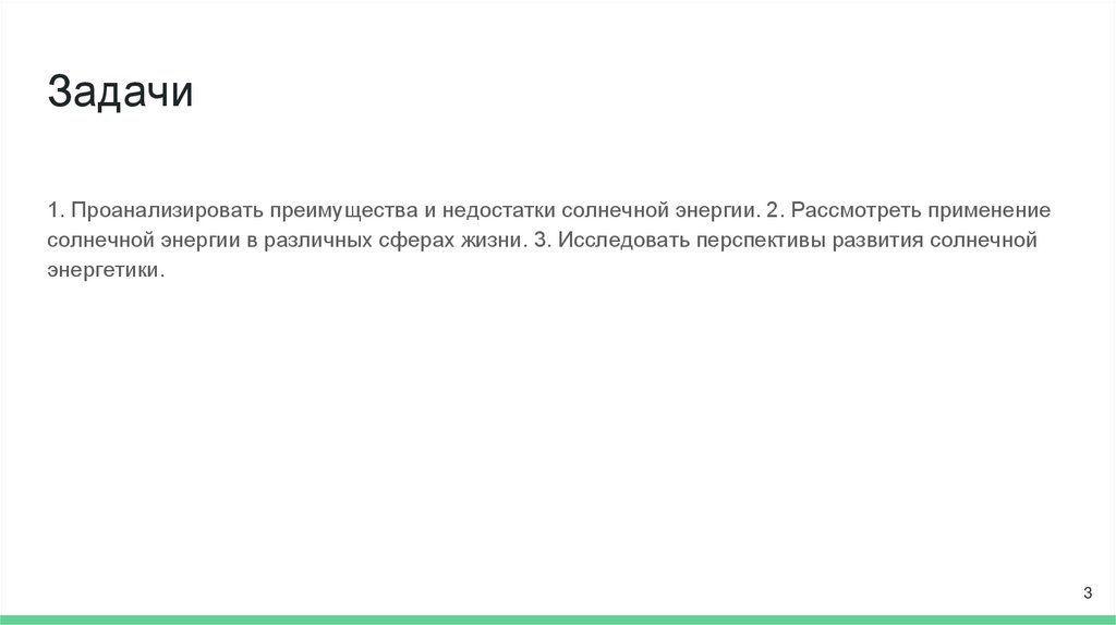 Задачи1. Проанализировать преимущества и недостатки солнечной энергии. 2. Рассмотреть применение