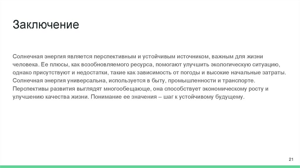 ЗаключениеСолнечная энергия является перспективным и устойчивым источником, важным для жизни