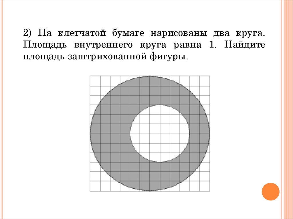 2) На клетчатой бумаге нарисованы два круга.Площадь внутреннего круга равна 1. Найдите