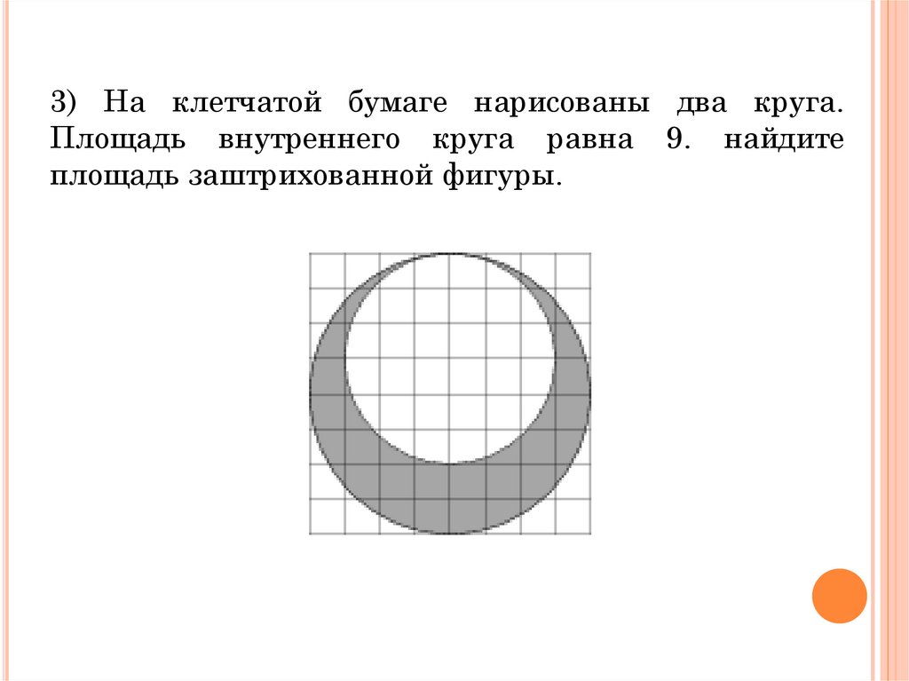 3) На клетчатой бумаге нарисованы два круга.Площадь внутреннего круга равна 9. найдите