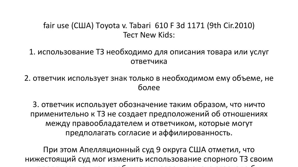 fair use (США) Тoyota v. Tabari 610 F 3d 1171 (9th Cir.2010)Тест New Kids: