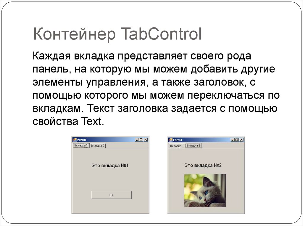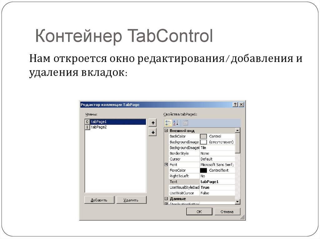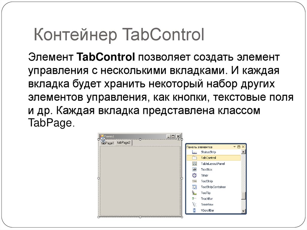 Контейнер TabControlКаждая вкладка представляет своего рода