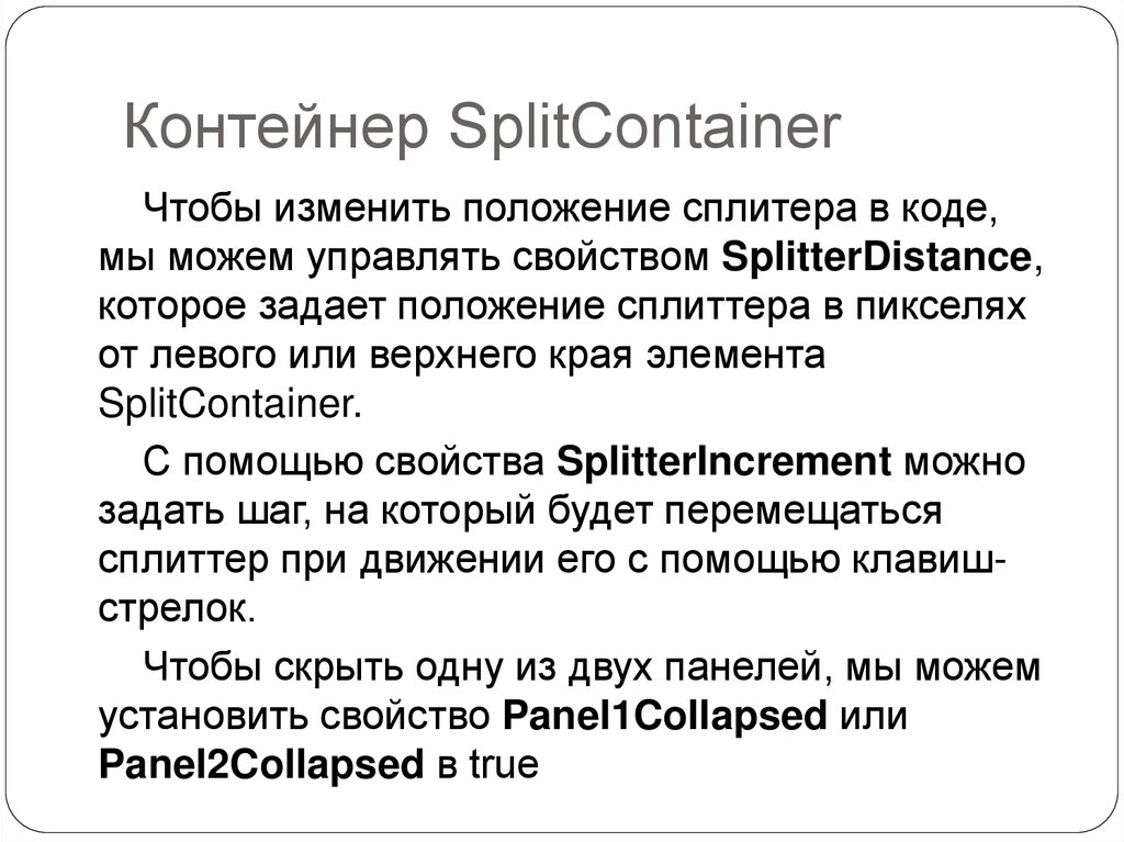 Контейнер SplitContainerЧтобы изменить положение сплитера в коде,