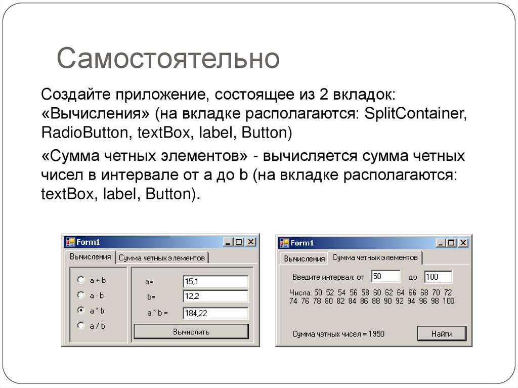 «Вычисления» (на вкладке располагаются: SplitContainer,