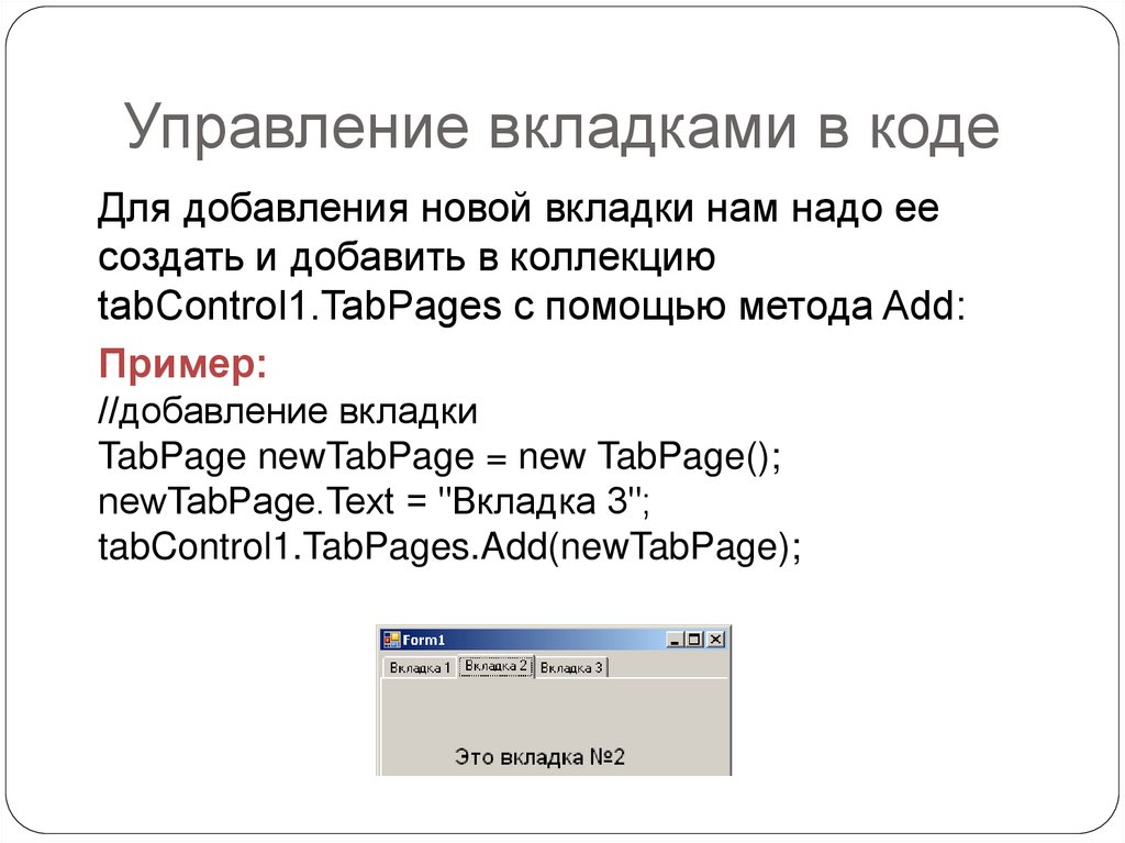 Управление вкладками в кодеДля добавления новой вкладки нам надо ее