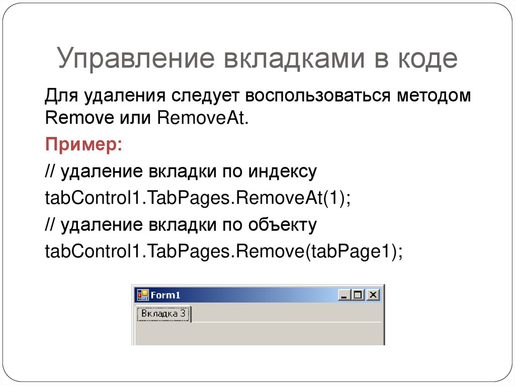 Управление вкладками в кодеДля удаления следует воспользоваться методом
