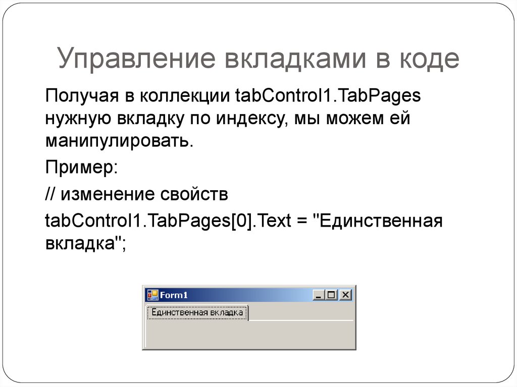 Управление вкладками в кодеПолучая в коллекции tabControl1.TabPages