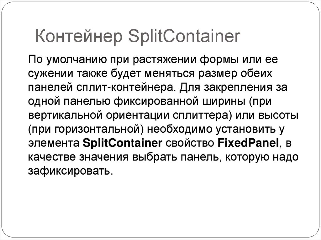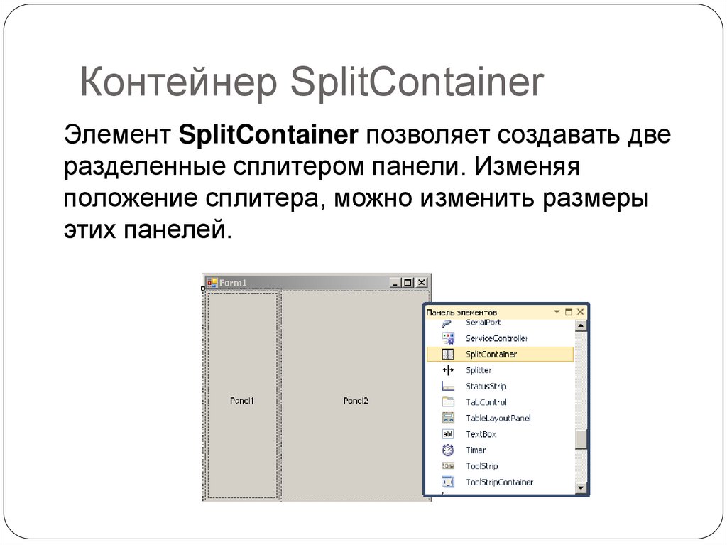 Контейнер SplitContainerЭлемент SplitContainer позволяет создавать две