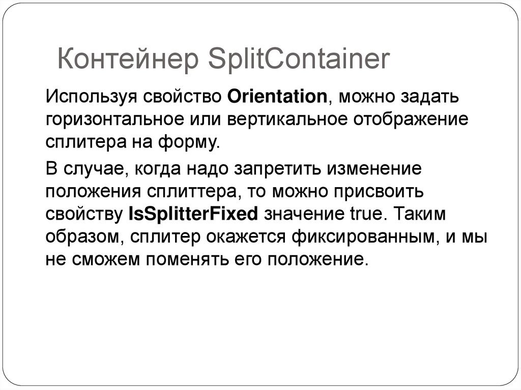 Контейнер SplitContainerИспользуя свойство Orientation, можно задать