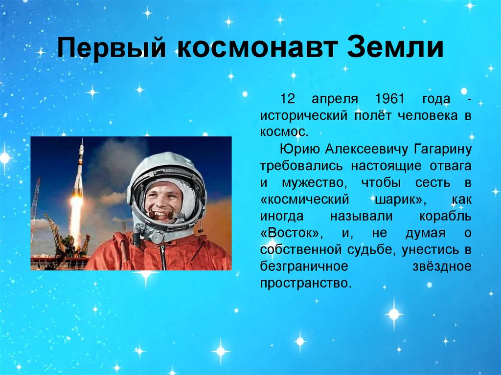 Первый космонавт Земли12 апреля 1961 года исторический полёт человека в