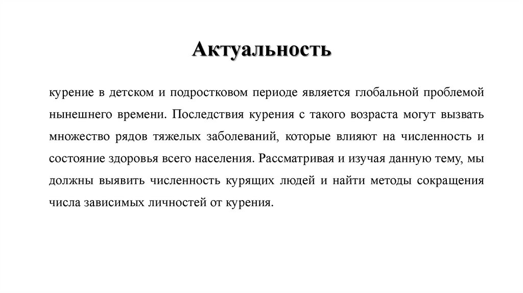 Актуальностькурение в детском и подростковом периоде является глобальной проблемой
