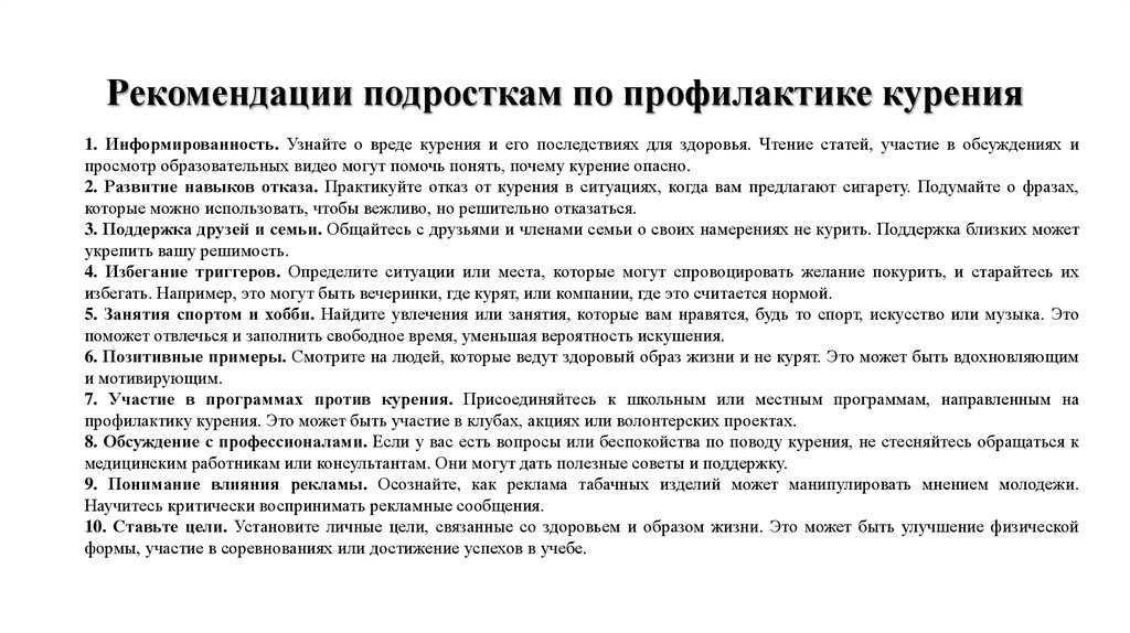 Рекомендации подросткам по профилактике курения1. Информированность. Узнайте о вреде курения и его последствиях для здоровья. Чтение статей, участие в обсуждениях и