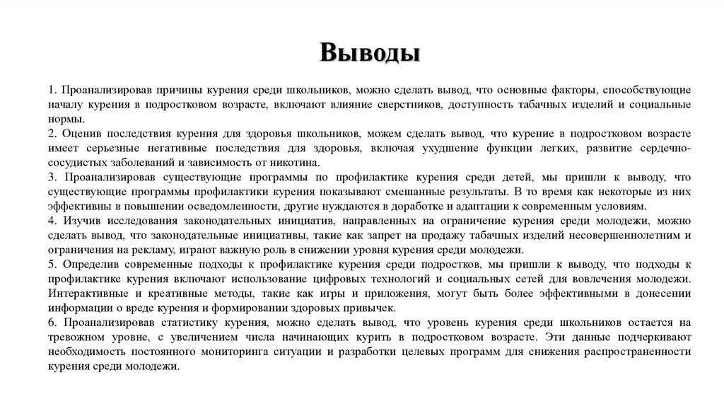 Выводы1. Проанализировав причины курения среди школьников, можно сделать вывод, что основные факторы, способствующие