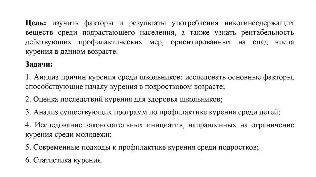 Цель: изучить факторы и результаты употребления никотинсодержащихвеществ среди подрастающего населения, а также узнать рентабельность