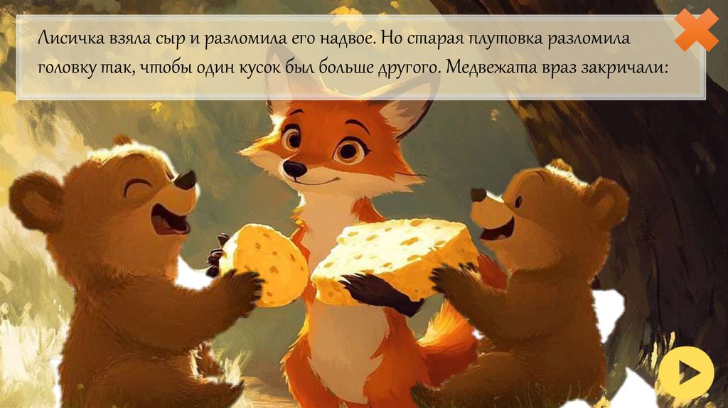 Лисичка взяла сыр и разломила его надвое. Но старая плутовка разломилаголовку так, чтобы один кусок был больше другого. Медвежата враз закричали: