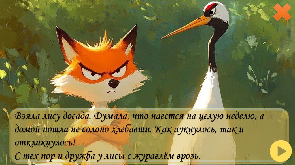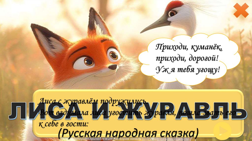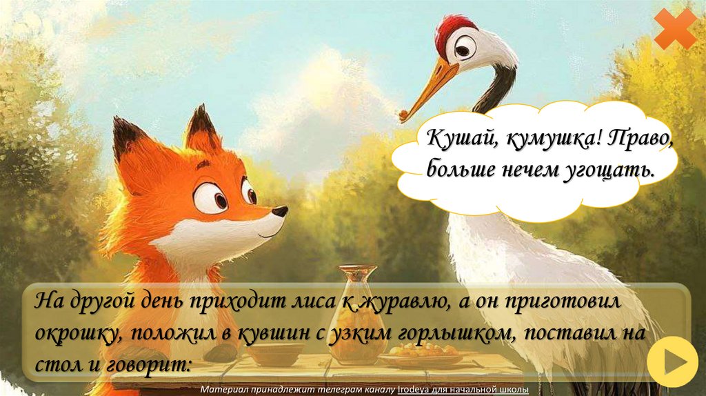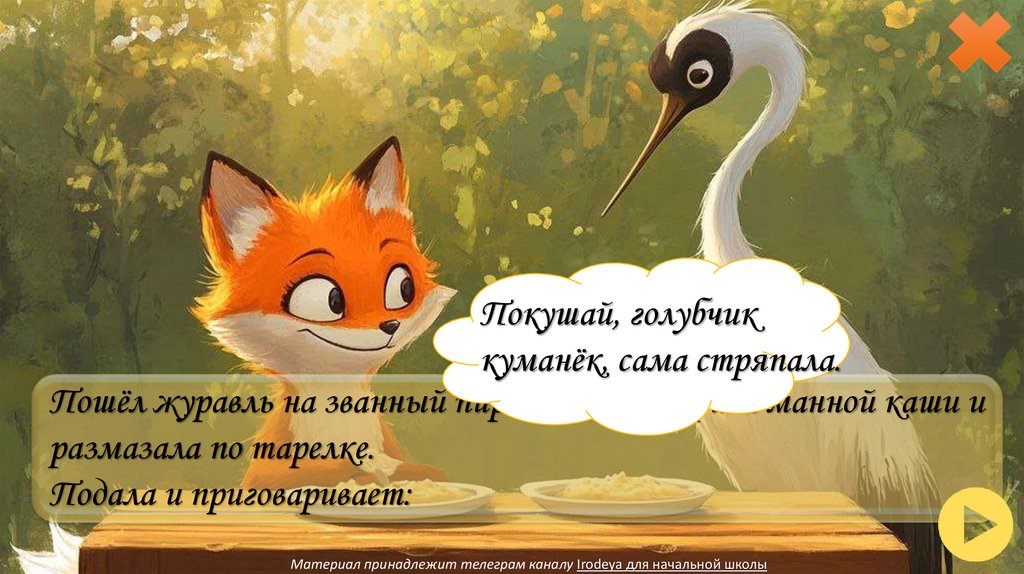 Пошёл журавль на званный пир. А лиса наварила манной каши и