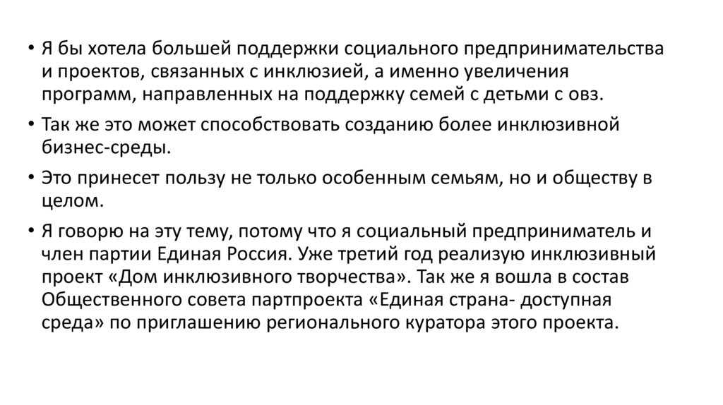 • Я бы хотела большей поддержки социального предпринимательстваи проектов, связанных с инклюзией, а именно увеличения