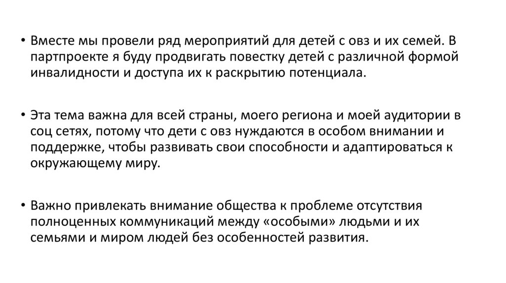 • Вместе мы провели ряд мероприятий для детей с овз и их семей. Впартпроекте я буду продвигать повестку детей с различной формой
