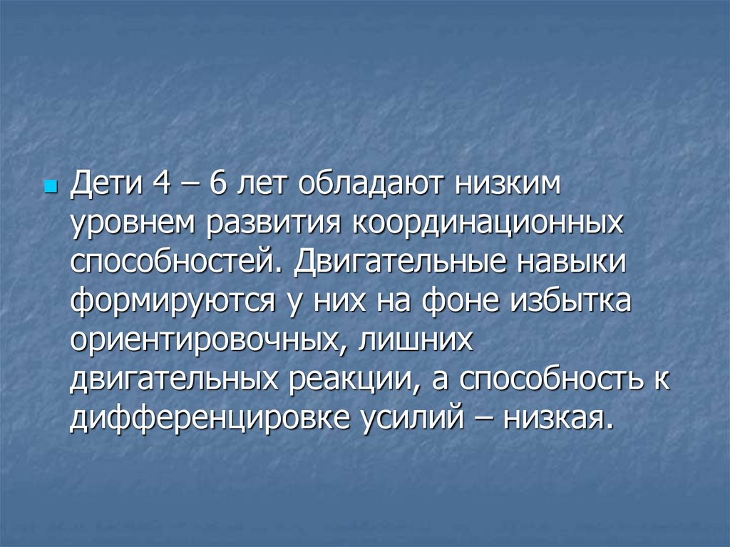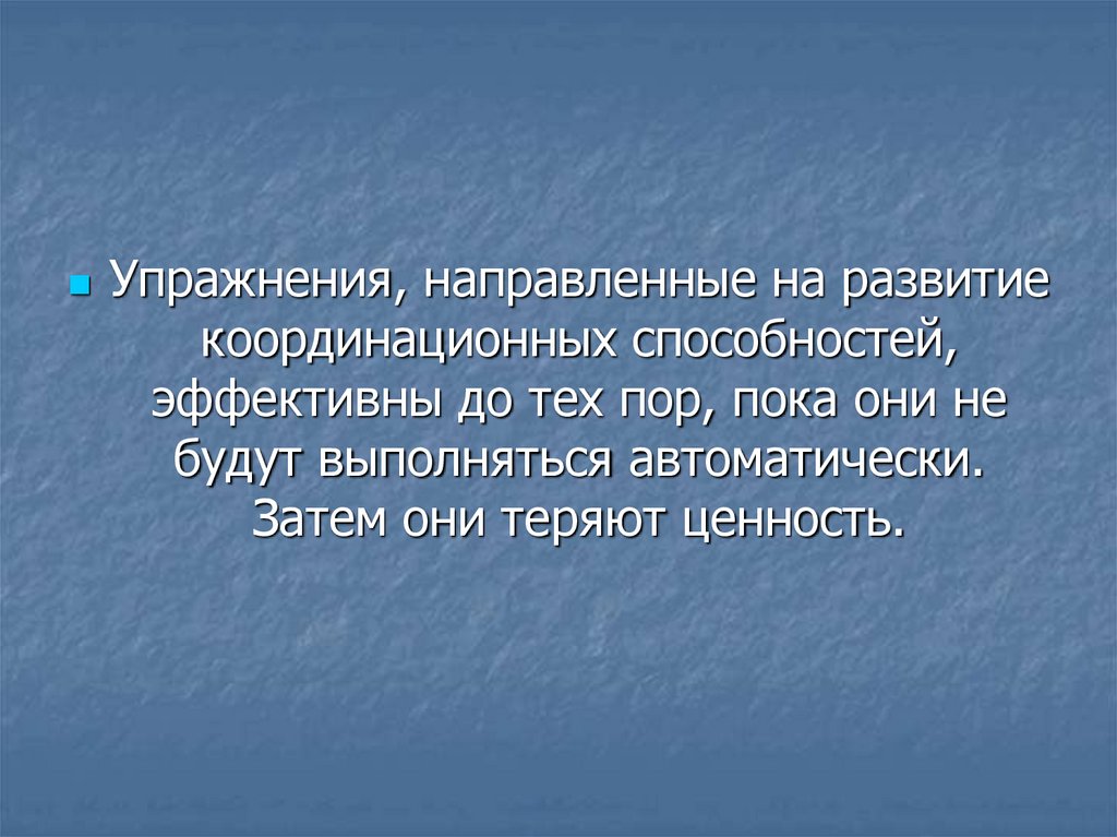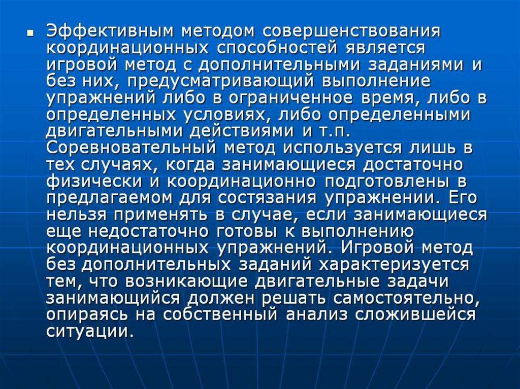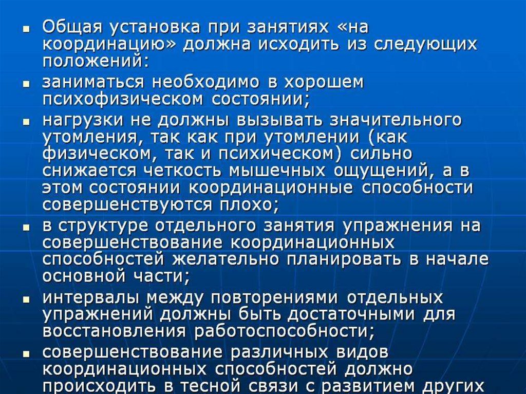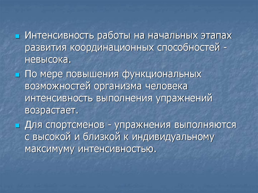 Интенсивность работы на начальных этапахразвития координационных способностей невысока.