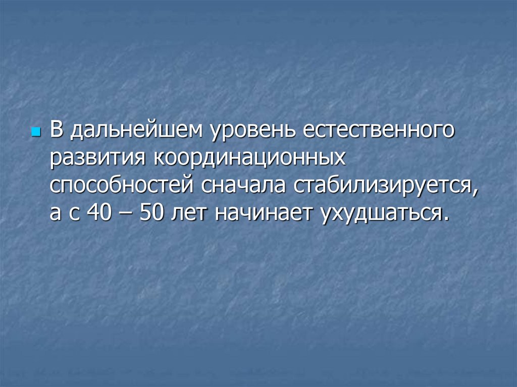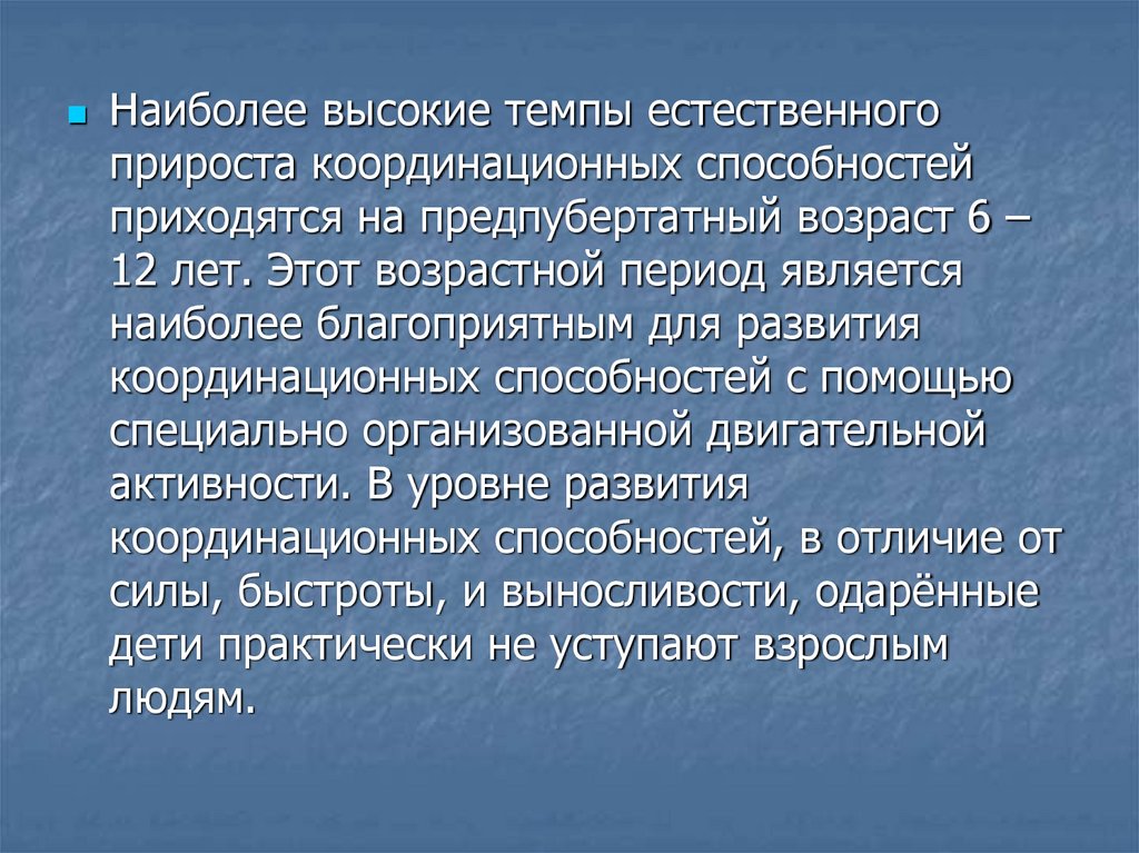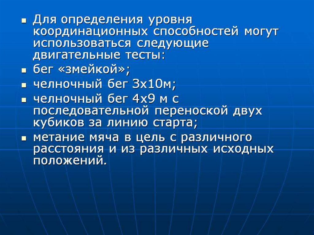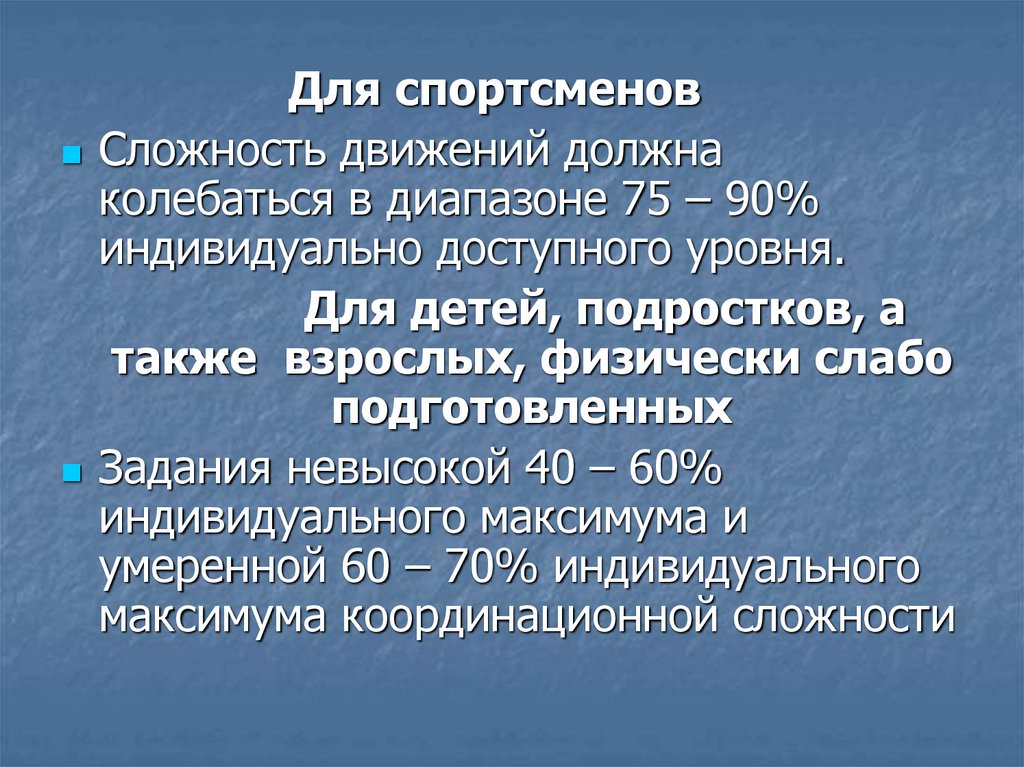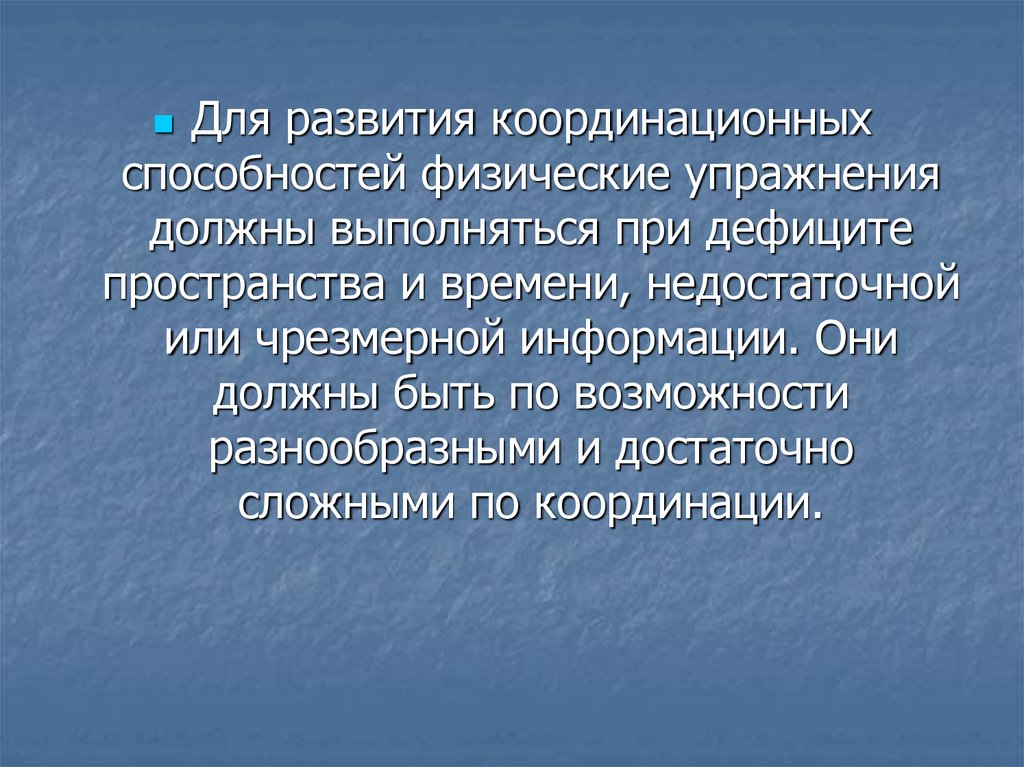 Интенсивность работы на начальных этапахразвития координационных способностей невысока.