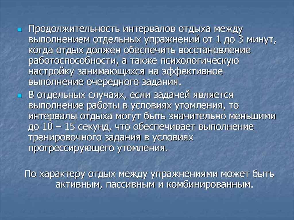 Продолжительность интервалов отдыха междувыполнением отдельных упражнений от 1 до 3 минут,