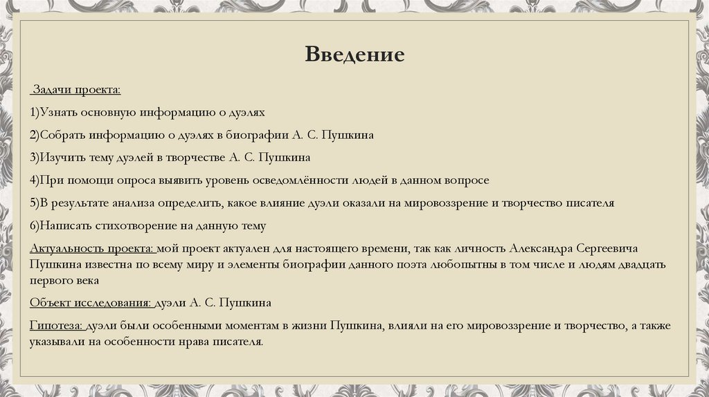 Гипотеза: дуэли были особенными моментам в жизни Пушкина, влияли на его мировоззрение и творчество, а также